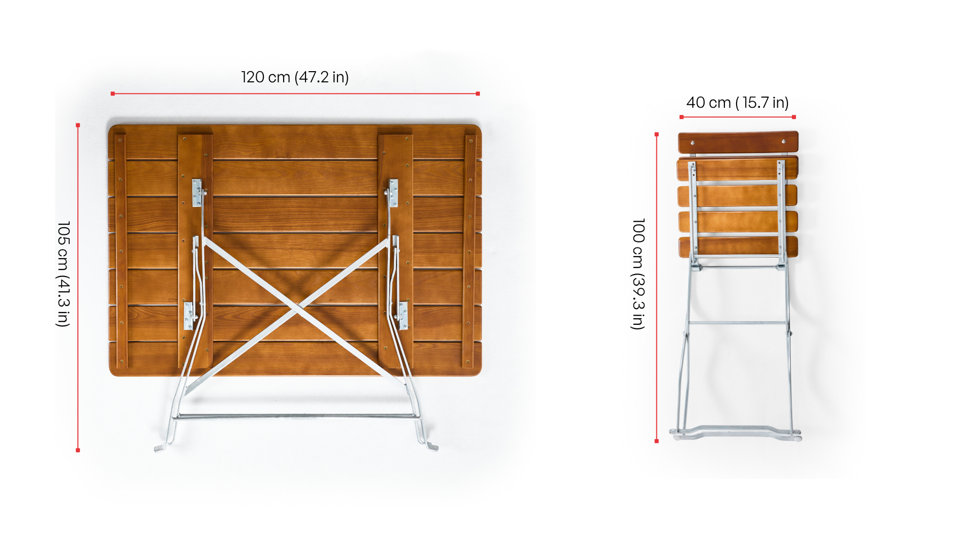 Wie die Brezn zur Weißwurst gehören unsere Biergartenmöbel zur urigen Gemütlichkeit eines Biergartens. Durch ihre robuste Konstruktion stehen sie stabil, auf festem wie auf weichem Untergrund – auf Asphalt, Schotter oder Kies. Und auch Regen brauchen die Biergartenmöbel nicht zu fürchten: Die witterungsbeständige Lasur schützt das Holz zuverlässig vor Nässe. Über die Winterpause lassen sich der Biertisch sowie die Stühle zusammenklappen und platzsparend verstauen – oder im Innenraum aufstellen: Dank der angebrachten Bodenschoner hinterlassen die Biergartenmöbel keine Kratzer auf empfindlichen Böden.